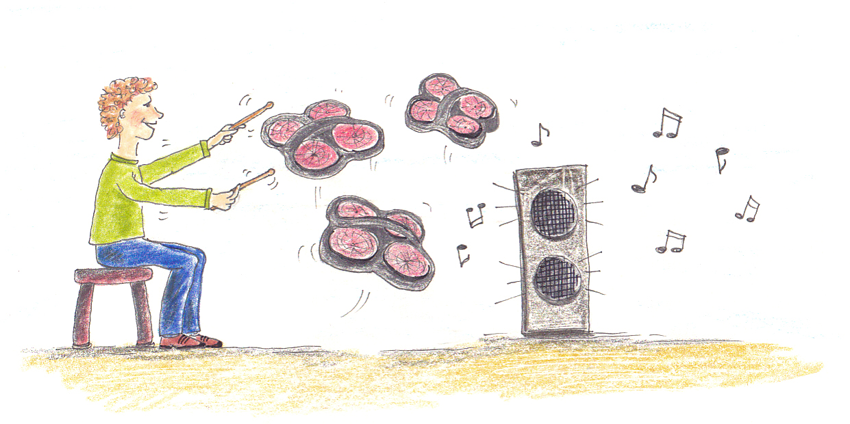 abstract = {This paper proposes the use of a quadrotor aerial vehicle as a musical instrument. Using the idea of interactions based on physical contact, a system is developed that enables humans to engage in artistic expression with a flying robot and produce music. A robotic user interface that uses physical interactions was created for a quadcopter. The interactive quadcopter was then programmed to drive playback of drum sounds in real-time in response to physical interaction. An intuitive mapping was developed between machine movement and art/creative composition. Challenges arose in meeting realtime latency requirements mainly due to delays in input detection. They were overcome through the development of a quick input detection method, which relies on accurate yet fast digital filtering. Successful experiments were conducted with a professional musician who used the interface to compose complex rhythm patterns. A video accompanying this paper demonstrates his performance.}